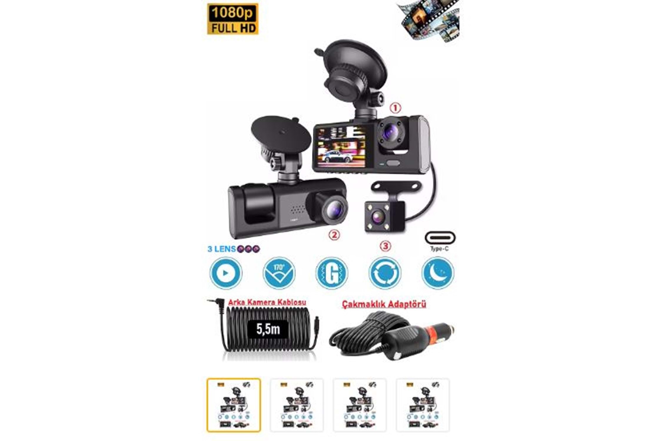 - 2.0" IPS Ekran - TF Kart Girişi (Max 128GB) - 5.0 MP / 30 FPS - Geri Görüş Kamerası ( 3 Kamera ) - Gece Çekimi - 170° Geniş Açılı Lens - 200 mAh Batarya - Türkçe Menü